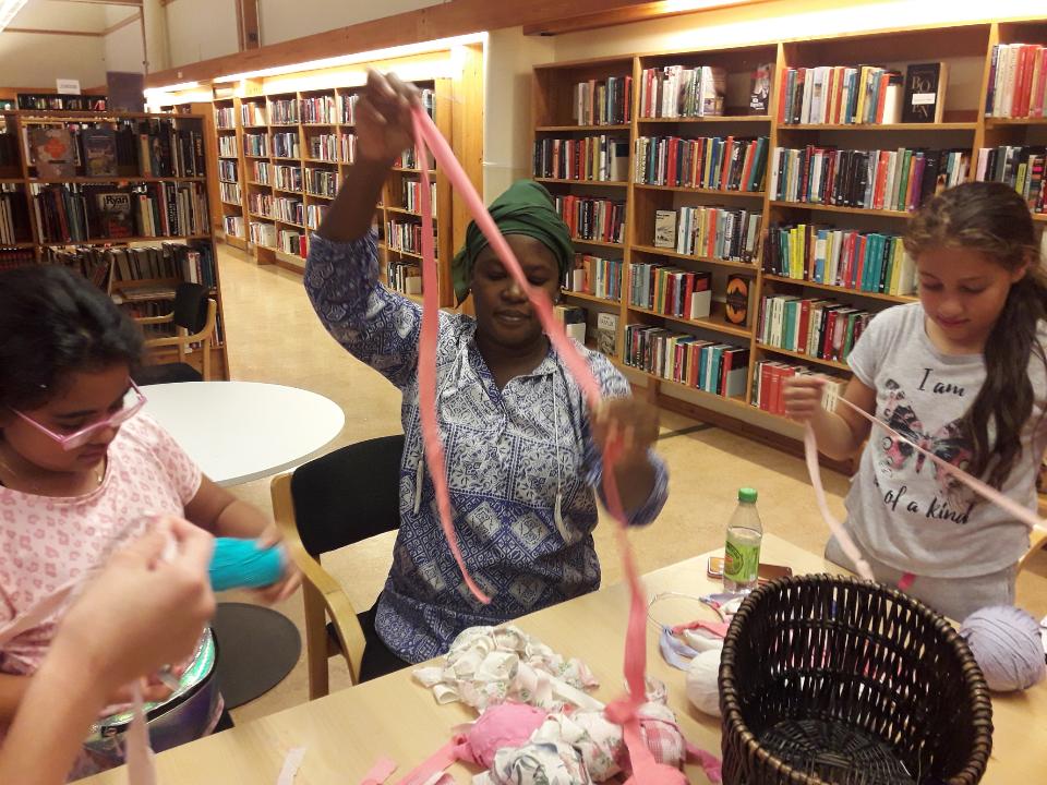I samband med vår vandrande klädstrecksutställning på bibliotek runt om i länet så ordnar vi prova-på-slöjdstillfällen.